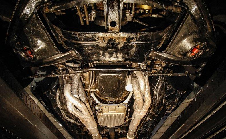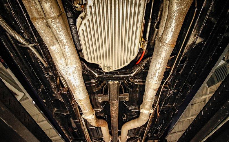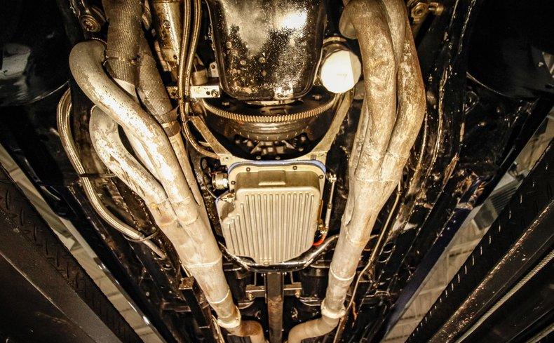 The engine build is as serious as it gets. Highlights include a Dart “Big M” block, ZL1 aluminum heads, forged Scat crank and pistons, solid roller cam with Crane Cam roller rockers, an 11:1 compression ratio, Team G Dominator intake, 850 cfm Demon carburetor, MSD ignition, and Hooker SuperComp headers. The transmission is competition-built with a reverse-mounted valve body, deep pan, and trans brake, while a Dana 60 rear end with 4.30:1 gears delivers power to massive 31x18.5x15 Mickey Thompson tires.