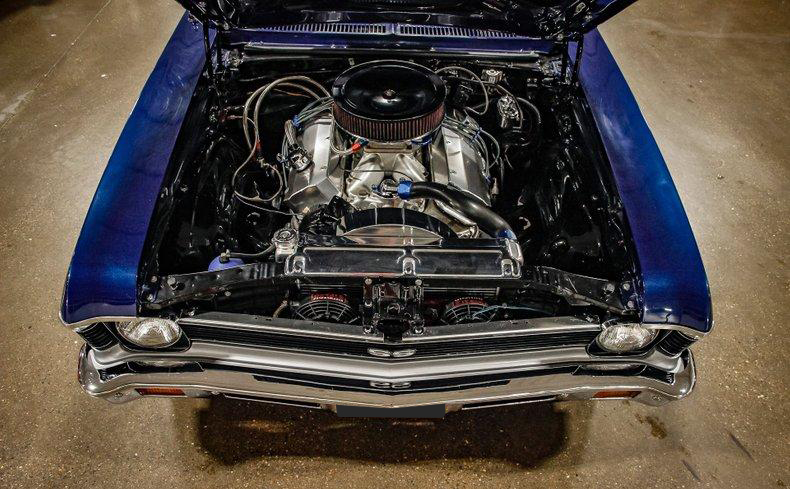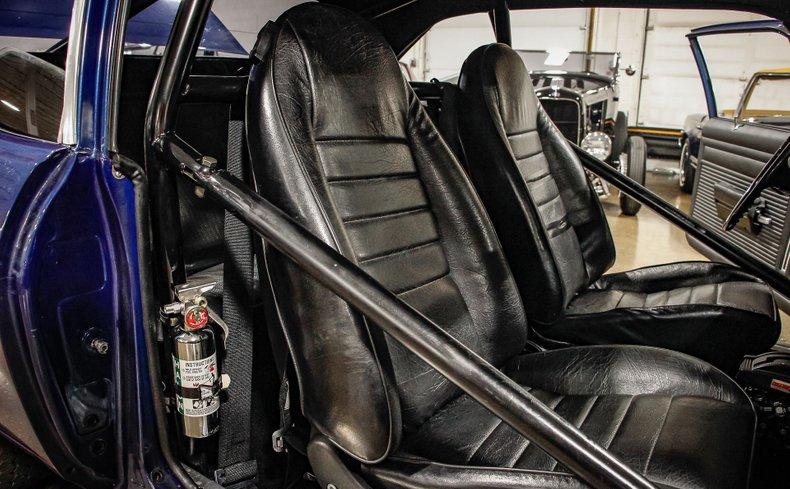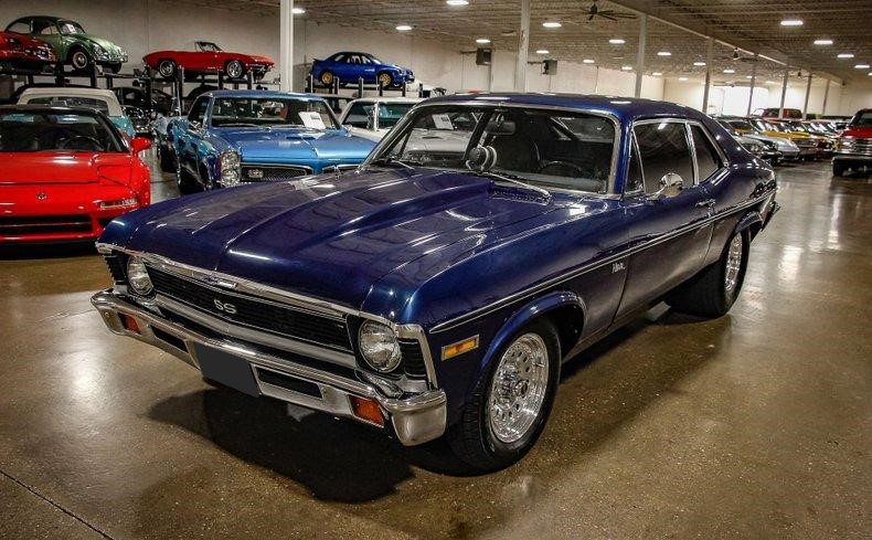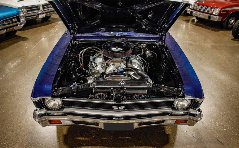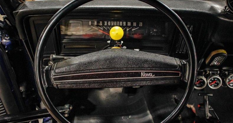 Despite its high-performance credentials, the exterior remains subtle and tasteful. Finished in deep dark blue metallic paint with thin red and bright blue pinstripes accenting the trunk lid and rocker panels, the classic Nova lines are clean and mostly uninterrupted. The only hints at the car’s monstrous power are the short spoiler on the trunk and the wide aftermarket wheels and tires peeking from the tubbed rear fenders. The paint, chrome, and trim have aged gracefully with a glossy depth that’s hard to look away from.