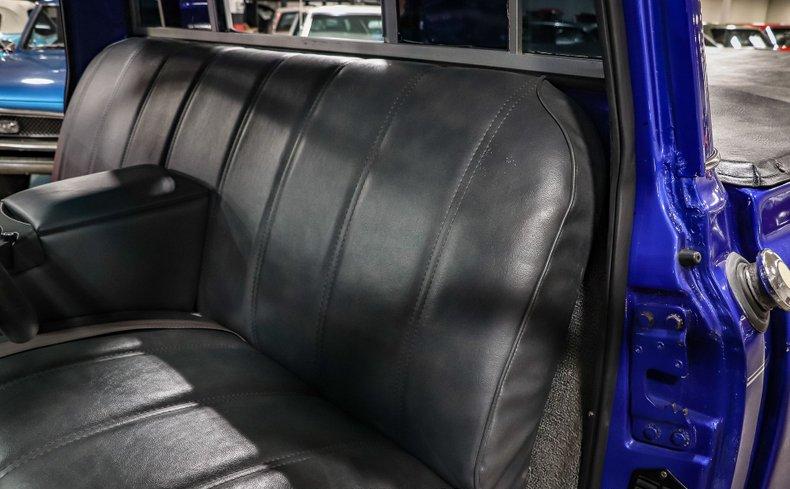 The truck’s exterior maintains its classic look, retaining original design cues like the eggcrate grille, embossed tailgate, and chrome bumpers. Side moldings have been removed for a cleaner profile, and a professionally applied color change from the factory Medium Red to the current vibrant blue gives the truck a fresh, glossy finish. A spray-in bedliner and soft tonneau cover help keep the bed protected and looking tidy. Finishing touches include polished 15-inch American Racing wheels wrapped in BF Goodrich white-letter tires.