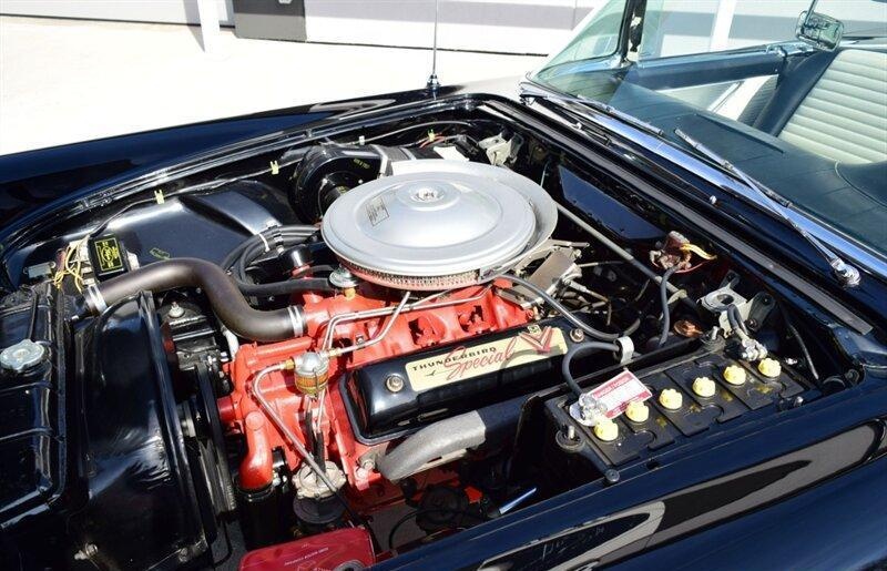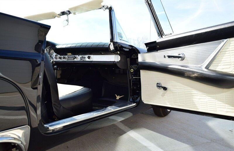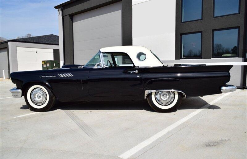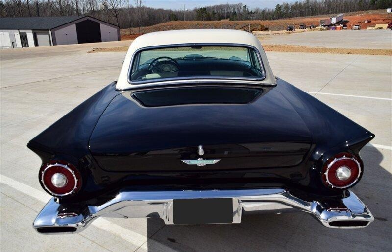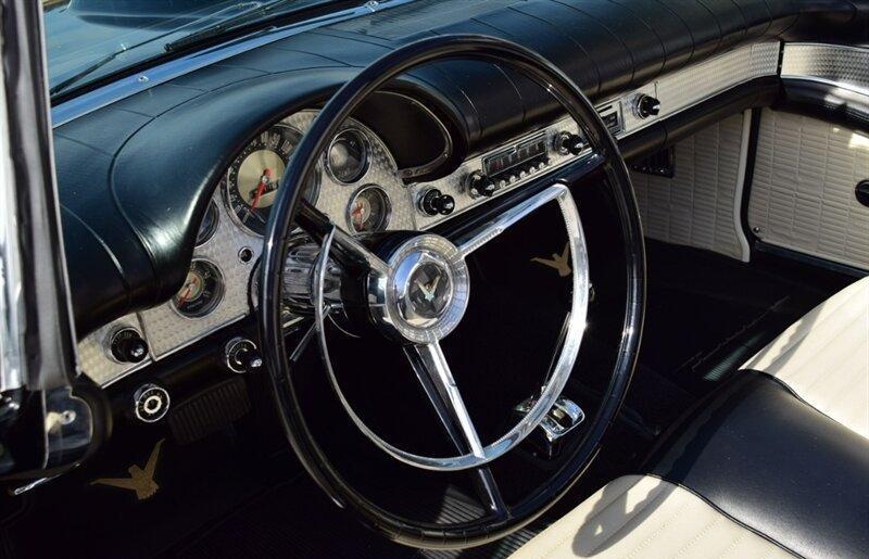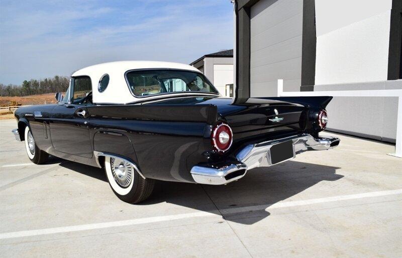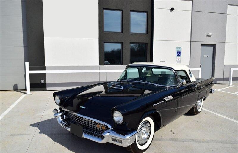 Beautiful Raven Black paint over classic black and white bench seat interior! 312 Thunderbird V8! Nice highly-correct restoration ready for a new home! The interior is what really completes the look on this T-bird! Black and white interior with the matching Raven Black exterior is a clean and classy combination sure to please any crowd. It really highlights the air of personal luxury these cars had when new! The interior, much like the exterior, is in great overall condition showing almost no signs of wear. Truly, this car received a top-shelf restoration. The 312 V8 runs like a champ, and starts readily with a turn of the key. This 1957 Thunderbird has that nice, subtle V8 exhaust sound you’d expect! The automatic transmission shifts smoothly, and this car is all the fun a classic T-bird should be. Despite being spec’d as a fairly low option car with no power options, this car is a delight to drive and would be considered by many to be a drivable show car.